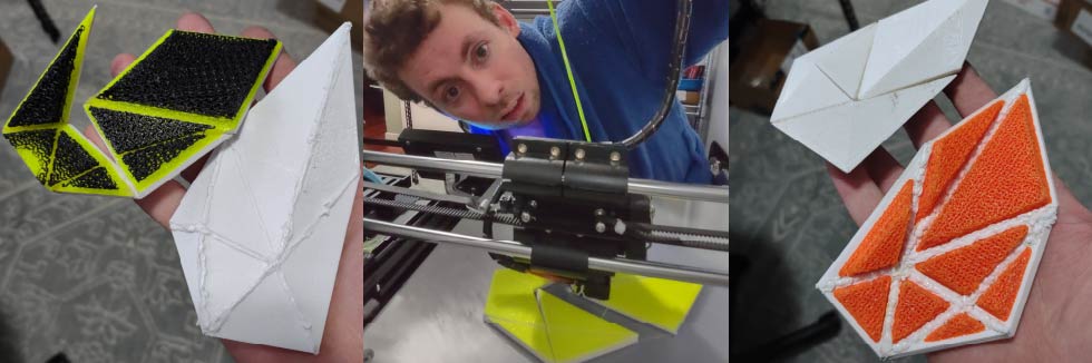I had the thought of the paneled construction and figured I could test that idea further. I created a sample geometry of 8 triangular polygons to manually test modeling them. The process worked and it was straightforward but tedious to intersect and define all the mated edges. I 3D printed two sample tiles sets, both with the flexible TPU layers printed directly over top of the hard PETG tiles. With the green and black padded ones (dual densities) I tried folding thin connecting edges and bonding them with West Systems G-Flex epoxy. On the white and orange test, I used a 3d pen to weld the seams together. This was a better solution as it was more accommodating of minor dimensional misalignments. However, I had to clear the padding elements on the interior to have clearance for the 3d pen. It also, obviously, leaves a large visible weld line that is far from ideal. In addition, folding even a thin layer or two did not really work as the extrusion lines tended to break apart.